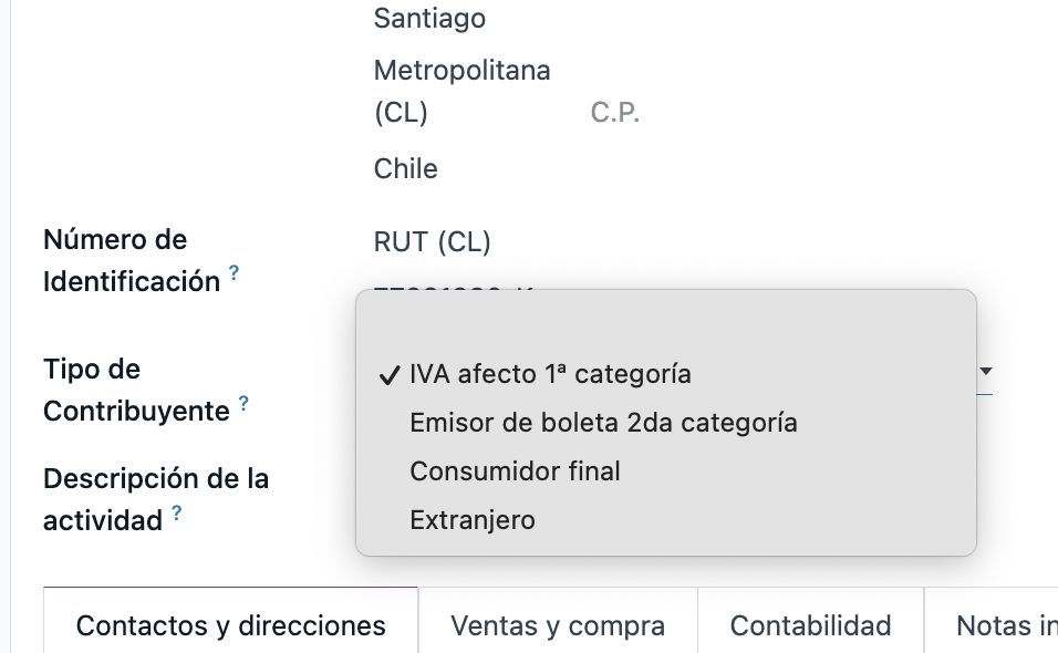 Si defines el tipo de contribuyente como "IVA Afecto primera categoría" o "emisor de boleta segunda categoría", al emitirle un documento tributario, Odoo elegirá automáticamente factura. Si el contribuyente es "Consumidor Final", elegirá automáticamente boleta. Si es extranjero, elegirá automáticamente factura de exportación.